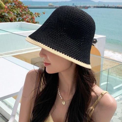 여성 여름 배색 라인 망사 밀짚 벙거지 모자 자외선 차단 휴가용 WFN2QVJ