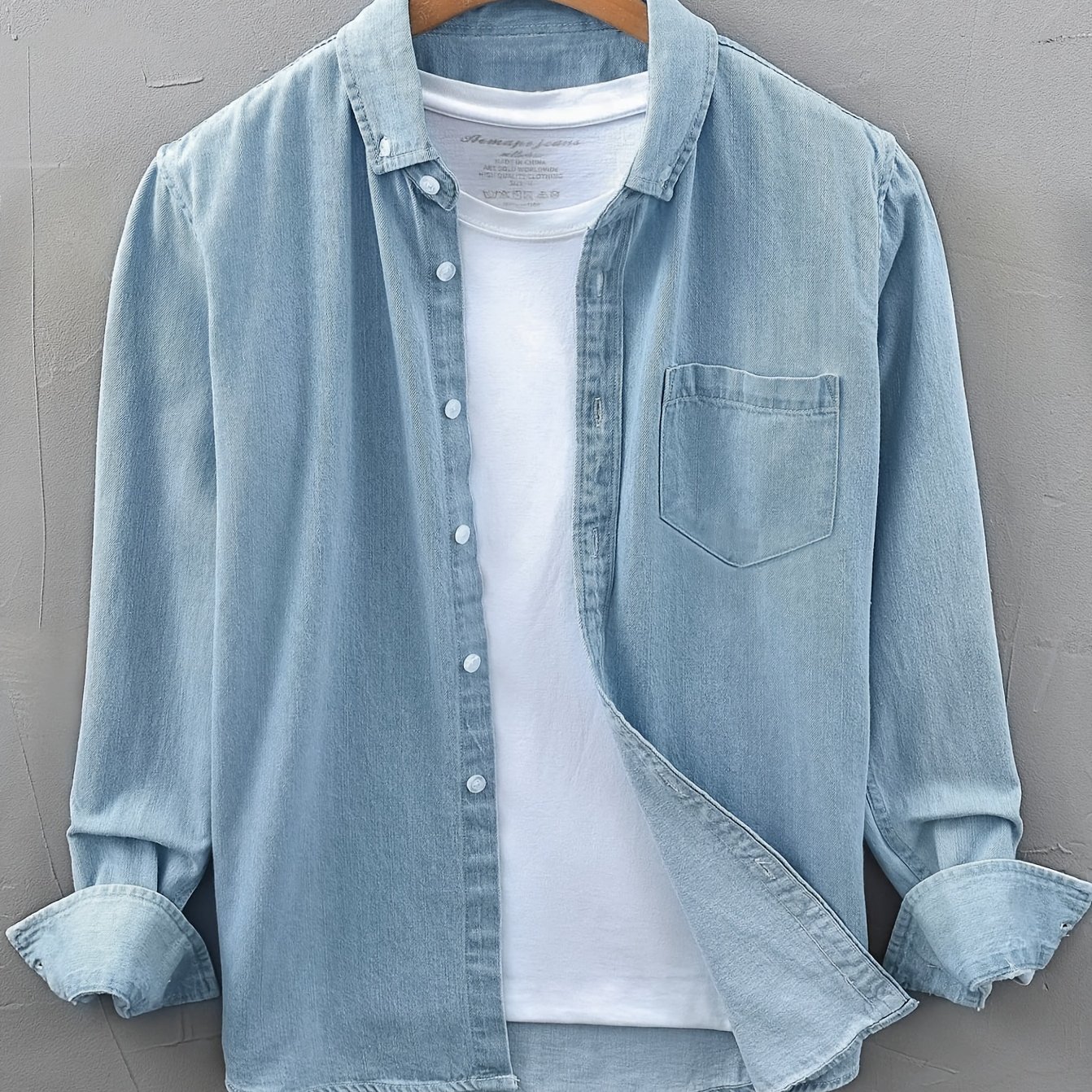 TEMU 남성 슬림핏 빈티지 캐주얼 페이크 데님 셔츠 | 긴소매, 버튼업, 신축성 없는 원단, 라펠 칼라, 가을/겨울에 적합
