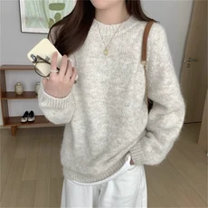오스틱니 2025 1+1 여성용 가을겨을 캐주얼 단색 날씬해 보이는 루즈핏 라운드넥 긴팔티 니트