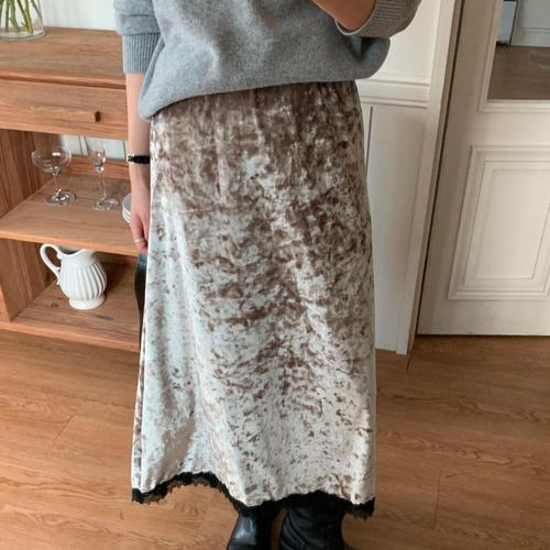[미라클세븐]여성 벨벳 A라인 스커트 배색 레이스 롱치마 가을용 밴딩 스커트
