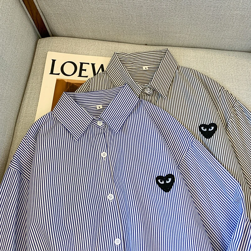 블루 스트라이프 긴 소매 자수 캐주얼 셔츠 여성 봄 가을 루즈핏 다용도 탑 한국 스타일 시크 셔츠