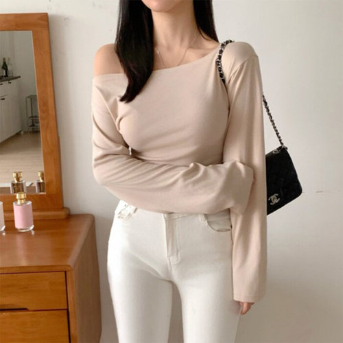 옷자락 / 여자 크롭 배꼽티 무지 슬림핏 오프숄더 가을 티셔츠