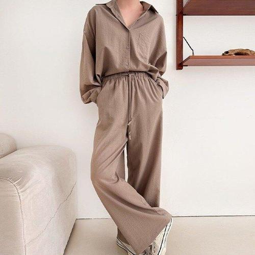 [문에이블]문에이블 여자 여성 가을 봄 루즈핏 베이직 셔츠 와이드 밴딩 팬츠 투피스 세트