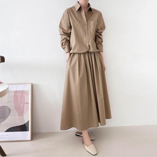 [문에이블]문에이블 여자 여성 가을 봄 데일리룩 루즈핏 밑단 스트링 셔츠 밴딩 스커트 투피스 세트