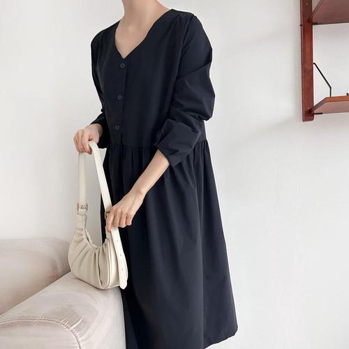 [신상오픈런]여성 가을 하객용 버튼 브이넥 롱원피스 박시핏