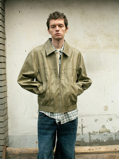 [샌드사운드] (UNISEX) 핸드페인트 페이크레더 점퍼 자켓 - 올리브 (MS5139A20J)