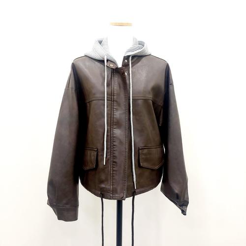 [보니스팍스(여성의류)]배색 후드 페이크 레더 점퍼 (XP2JP002M0)
