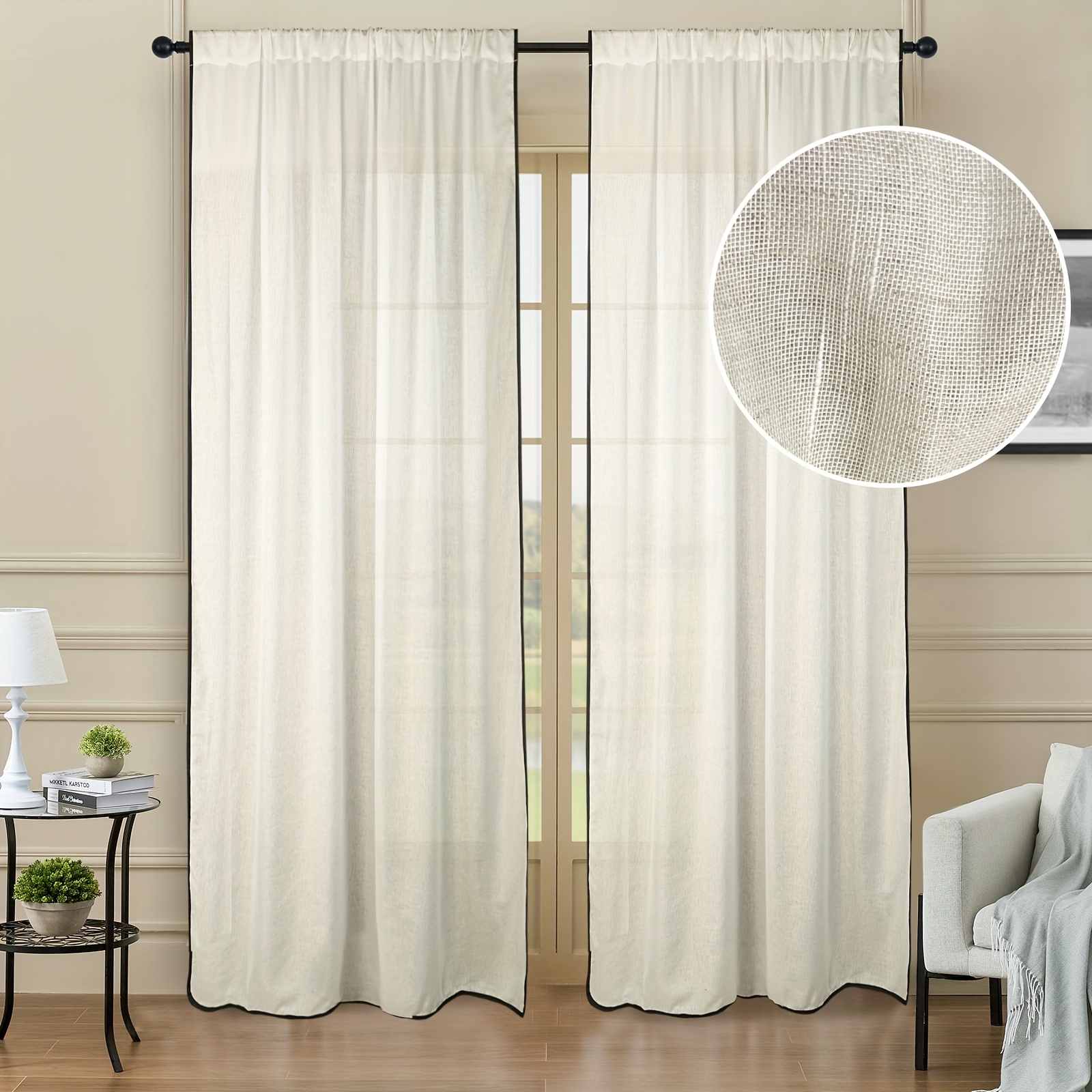 TEMU 2개 검정색 레이스 가장자리 흰색 보일 커튼, 레트로 단색 커튼, 주방 거실 서재 발코니 장식에 적합
