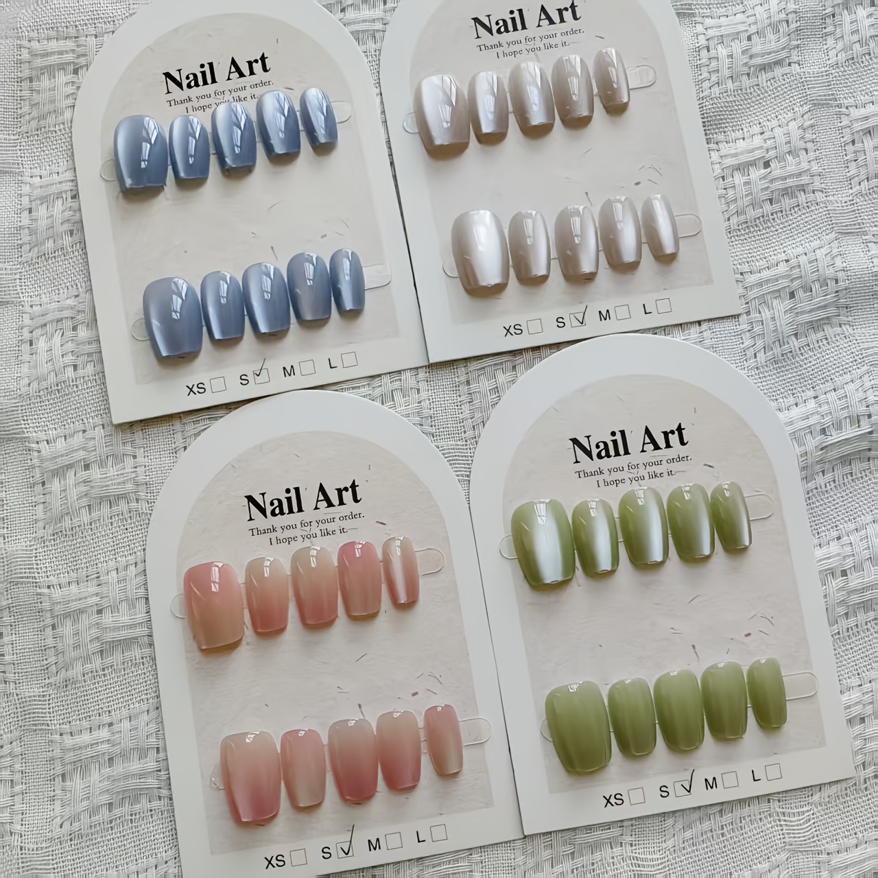 TEMU 40개 솔리드 컬러 캣 아이 프레스온 네일 세트 - 그라데이션 핑크/블루/글리터 애프리콧/밝은 그린 4가지 색상 - 패셔너블 데이트 웨어 또는 DIY 네일 아트용 숏 발레 매니큐어|네일아트