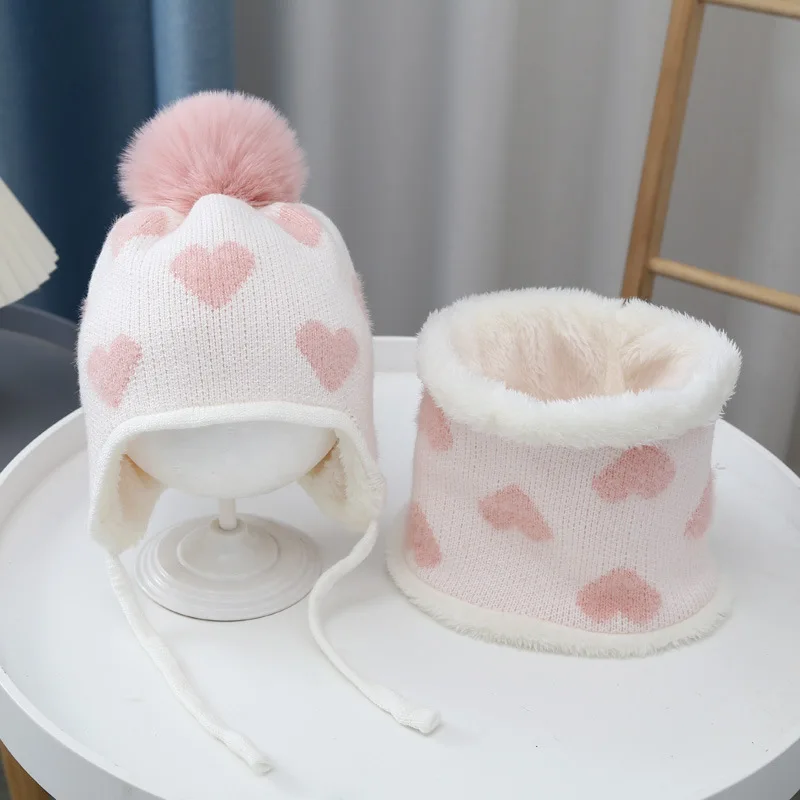 겨울 니트 어린이 모자 & 스카프 세트 양털 안감 따뜻한 어린이 비니 모자 아기 소녀 귀 보호 pompom 유아 모자 0-3Y