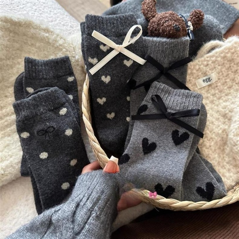 TEMU 하트 패턴과 리본 매듭이 있는 혼합 색상의 미드 카프 양말 3켤레 | 한국 및 일본 스타일, 가을과 겨울에 따뜻하고 귀여움, 원단, 손세탁만 가능