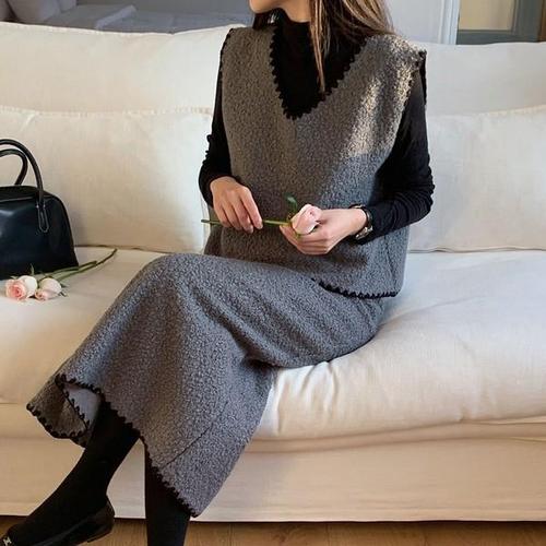 [옷자락] 여자 겨울투피스 뽀글이 브이 조끼 일자 스커트 세트