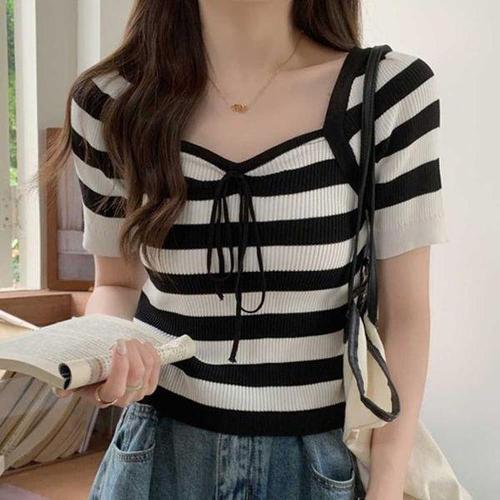 [셀러허브_여성트랜드패션]ONM 리본 스퀘어넥 스트라이프 반팔 니트 썸머 골지
