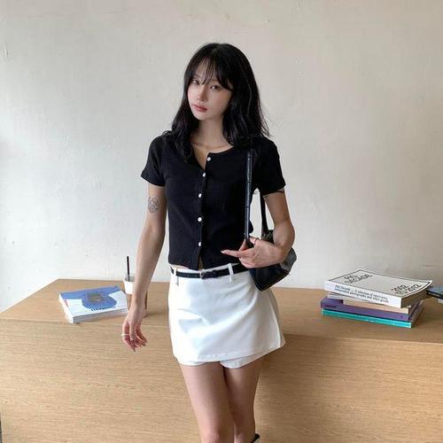 [미라클세븐]여성용 크롭 반팔 가디건 코튼 세로골지 라운드넥 단추 디자인