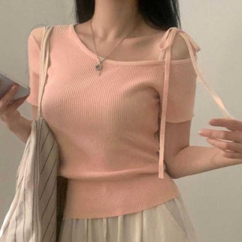 [셀러허브_여성트랜드패션]ONM 여성용 큐티 러블리 어깨 리본 골지 반팔 니트