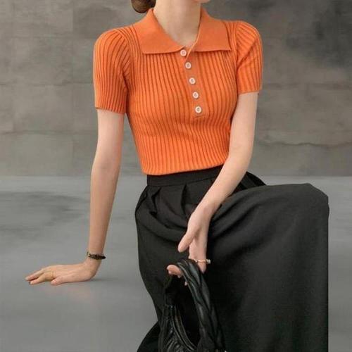 [셀러허브_여성트랜드패션]ONM 핏 골지 카라 반팔니트 여름 하프버튼 티셔츠