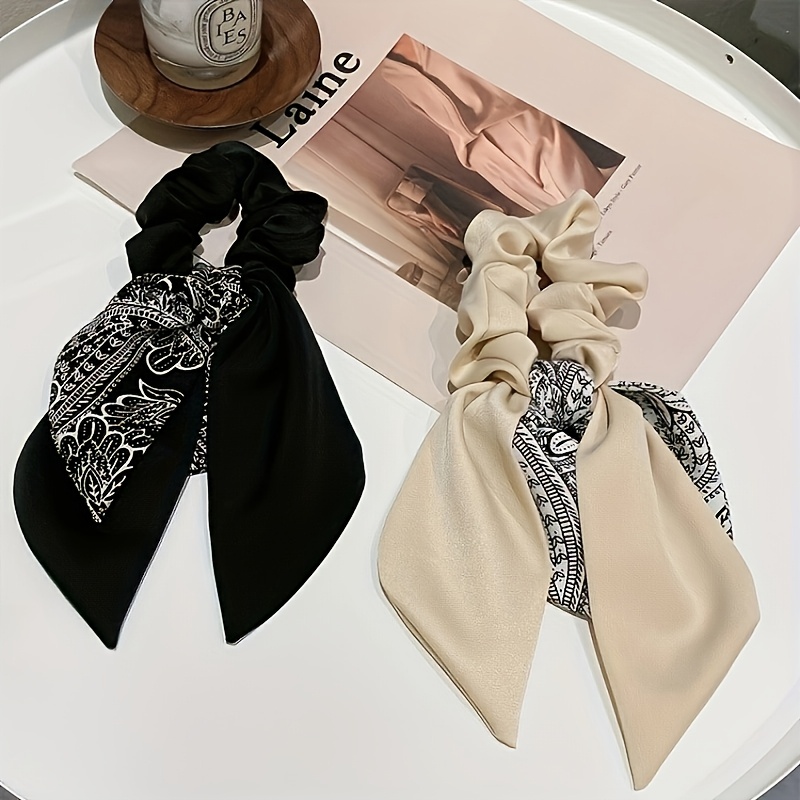 TEMU 2개 블랙 & 화이트 플로랄 매듭 헤어 클립 - 포니테일용 스타일리시 리본 머리끈, 여성 패션 헤어 액세서리와 우아한 페이즐리 무늬, 패셔너블 헤어 클립 | 매듭된 헤어밴드 | 우아한 원단, 귀여운 헤어 클립