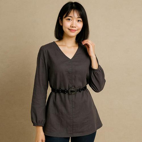 [샵앤][샵앤] 여성 노카라 V넥 심플 무지 긴팔 롱 블라우스 SML-WBL-4920-그레이