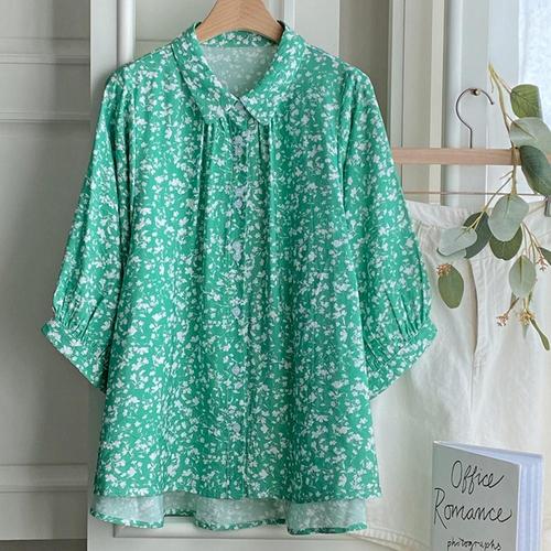 여성 카라넥 꽃무늬 셔링 5부소매 2컬러 블라우스 DGB-WBL-4375-그린