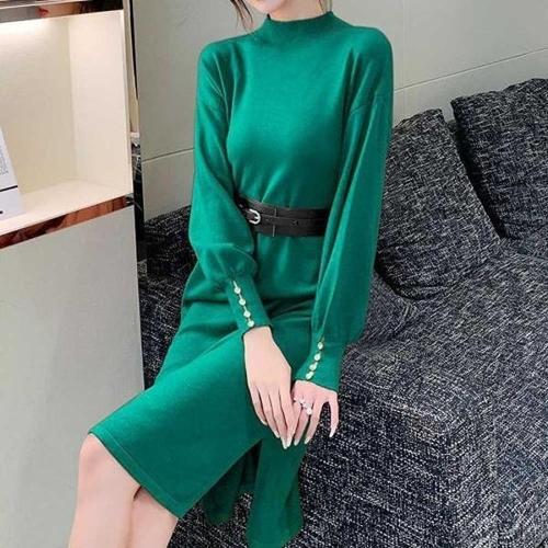 POMTOR 여성 고급스러운 빈티지 빅사이즈 허리끈 언발 니트 미디 원피스