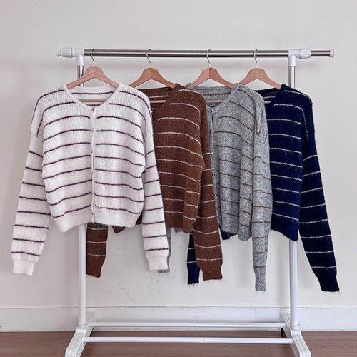 케이클럽 [MADE/1만장돌파]온리 프리미엄 금장 세미크롭 니트 가디건 (S-L/데일리룩/가을아우터/스트라이프/라운드넥)