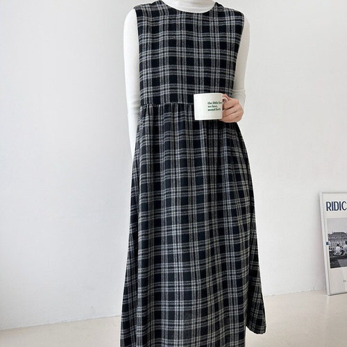 플러리싱 / 클래식 체크 기모 민소매 롱 원피스 플러리싱