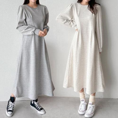 [유야]여성 기모 무지 핀턱 퍼프 긴팔 롱 원피스 -FOP0444- 겨울