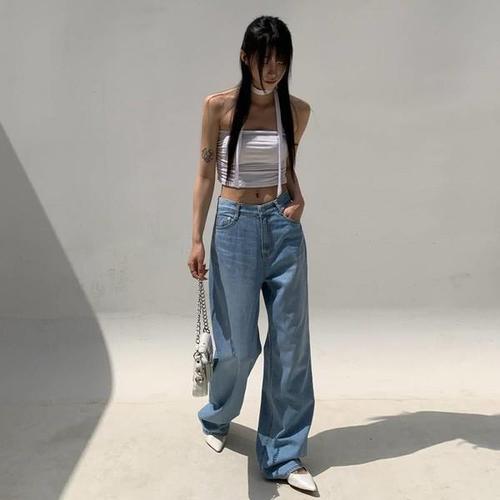 [에이치플러스몰]여성 기본 일자 스타일 중청 와이드핏 워싱 청바지