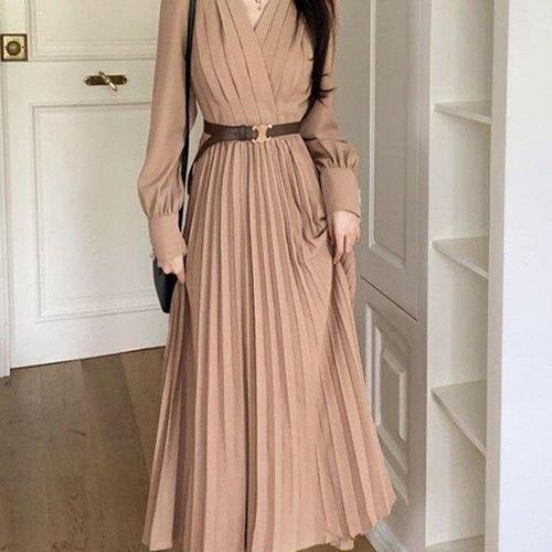 여자 브이넥 랩 레이어드 플리츠 롱 원피스_3