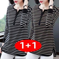 1+1 2장입 세트 여성 빅사이즈 봄가을 얇은 스트라이프 긴팔 티셔츠 엄마옷 베이직 코디 부드러운 소재 캐주얼 데일리 티셔츠