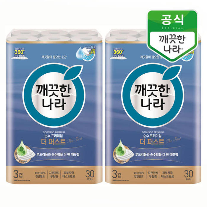 깨끗한나라 순수 프리미엄 더 퍼스트 천연펄프 3겹 고급롤화장지, 30m, 30개입, 2개