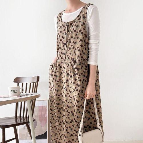 [신상오픈런]여성 꽃무늬 포켓 버튼 슬리브리스 면 골덴 롱드레스