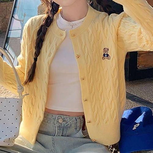 [셀러허브_여성트랜드패션]ONM 라운드넥 곰돌이자수 하트단추 꽈배기 긴팔가디건