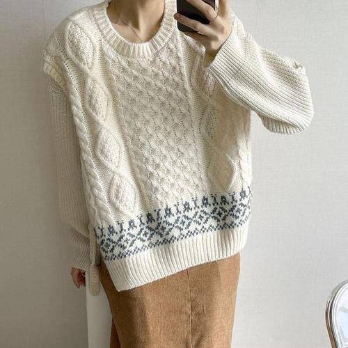 [옷자락]여자 꽈배기 노르딕 배색 패턴 라운드 옆오픈 니트조끼