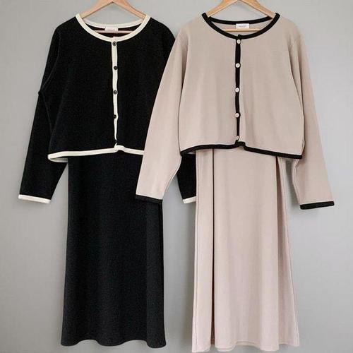 [신상오픈런]여성 배색 라운드넥 가디건과 끈 나시 롱 드레스 세트