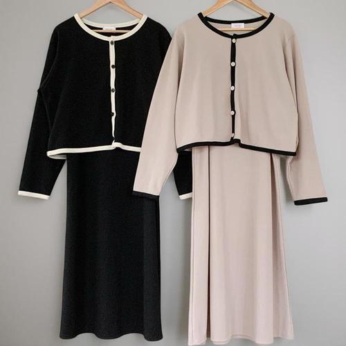 [신상오픈런]여성 배색 라운드넥 가디건과 끈 나시 롱원피스 세트
