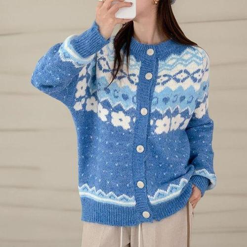 [신상오픈런]여성 카라넥 나그랑 배색 눈꽃 패턴 집업 가을 니트 가디건
