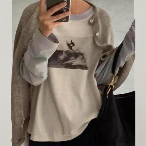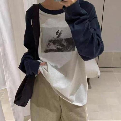 [신상오픈런]여자 빈티지 프린팅 배색 나그랑 롱슬리브 스판 티셔츠