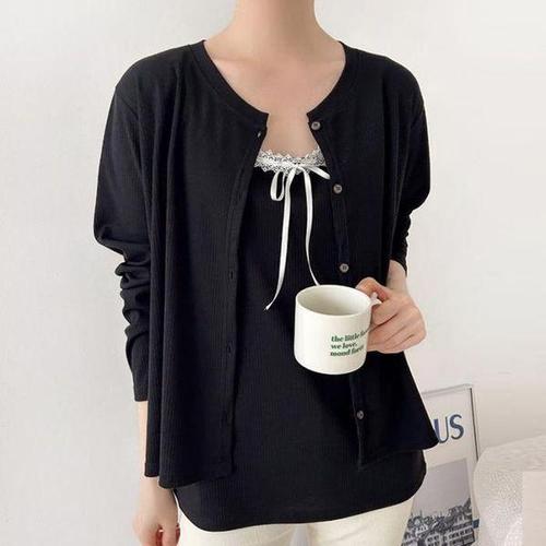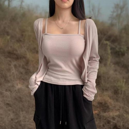 [신상오픈런]여성 크롭 나시와 롱슬리브 가디건 세트 심플한 싱글버튼 스타일