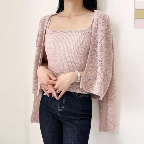 [신상오픈런]여성 크롭 가디건 셋트 무지컬러 어깨끈 나시 셔링 디자인