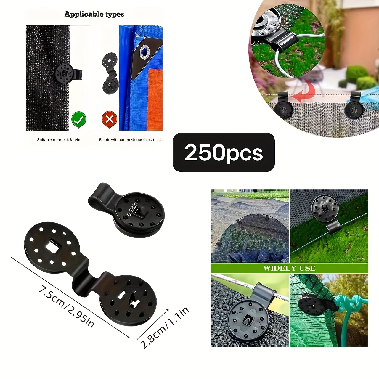 TEMU 250개 블랙 헤비듀티 PP 플라스틱 차양망 클립, 원형 이어렛 & 방수 버클 - 사계절용 내구성 있는 다중사이즈 검은색 클립 (날카로운 이빨 디자인)로 차양망, 정원 가림막, 캐노피, 타프, 메쉬펜스를 안전하게 고정 - 실내/외부 사용에 적합, 간편한 설치(나사/접착제 불필요) - 발코니, 파티오, 풀장 울타리, 프라이버시 스크린에도 완벽