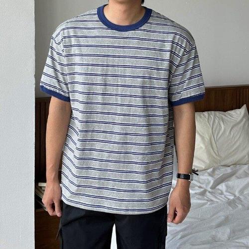 [피팅남]남자 데키 오버핏 여름 단가라 스트라이프 반팔