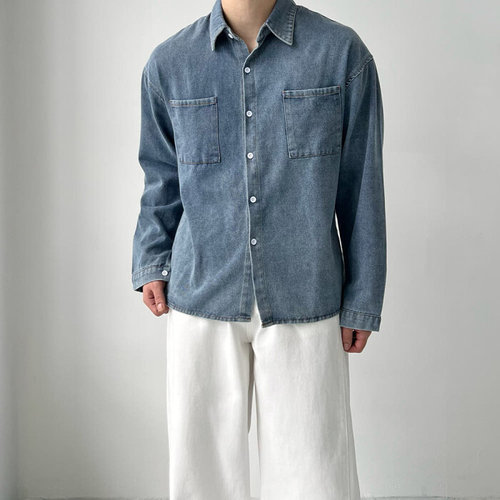 남자 남성 고퀄리티 루즈 오버핏 입체 포켓 청 데님 긴팔 남방 셔츠