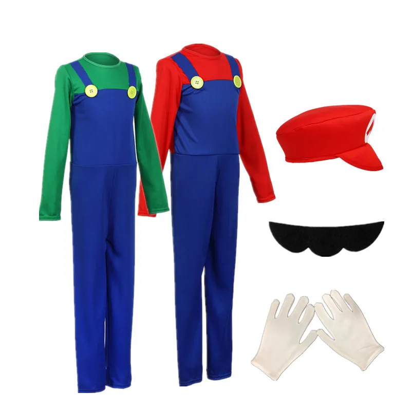 어린이 게임 점프수트 코스프레 의상 (모자, 장갑, 수염 포함) 애니메이션 브라더스 역할놀이 남아 여아 파티 재미있는 의상