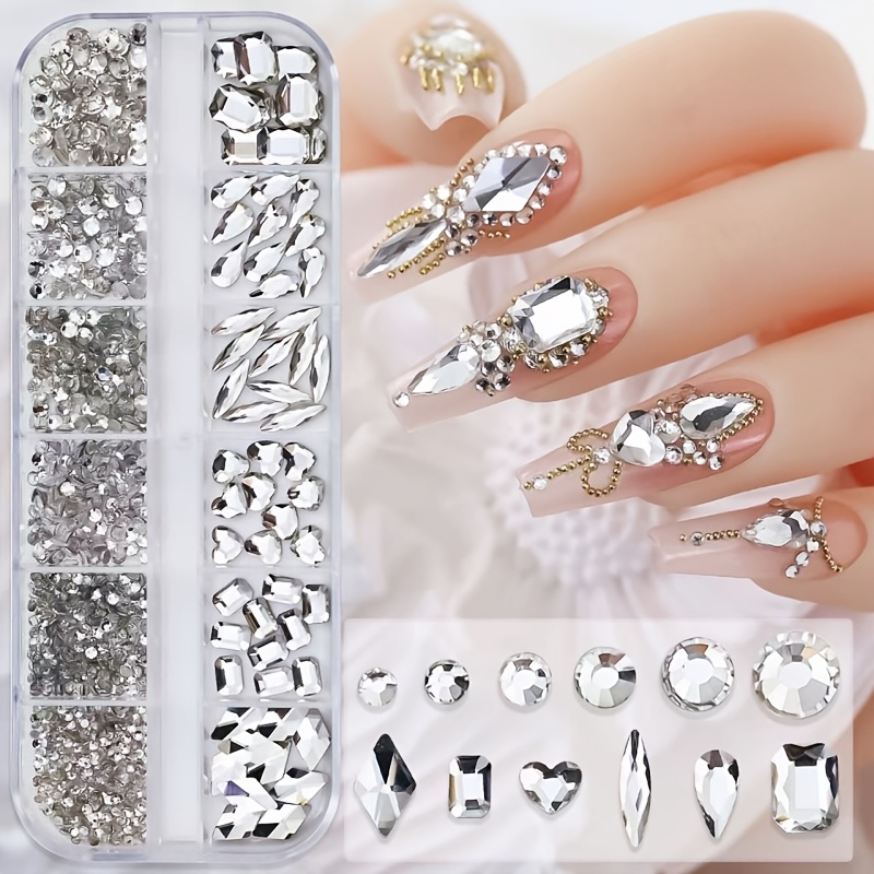 TEMU 12색 투명 화이트 라인스톤 네일 아트 세트 - 혼합 원형 & 하트 모양 드릴 스톤, 무접착 베이스, 네일 아트용 보석 장식, 네일 아트 용품, 하트 모양 라인스톤, 내구성 좋은 라인스톤