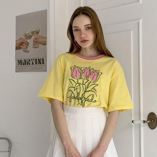 [브이와이][VY] 여자 귀여운 콘트라스트 키치룩 꽃무늬 튤립 노랑색 티셔츠_16696811_588847