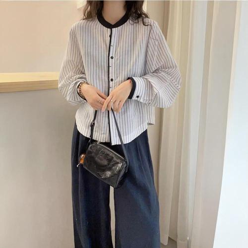 [옷자락]여자 클래식 배색 스트라이프 노카라긴팔 셔츠