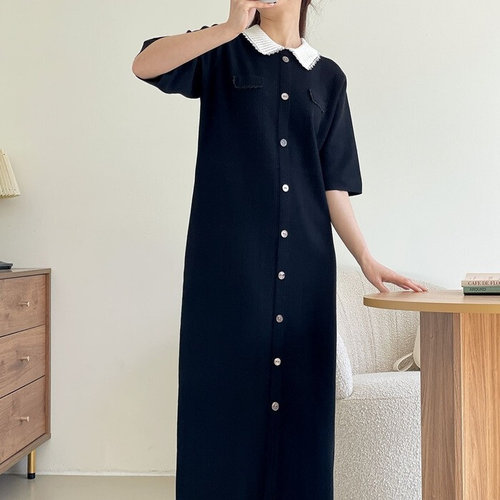 플러리싱 / 레이스 배색 카라 반팔 버튼 니트 롱원피스 플러리싱