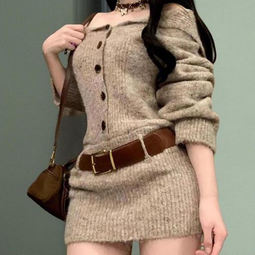 COSYEVNO 여성 봄가을 긴팔 슬림핏 니트 미니 원피스 버튼 장식 TZKlyq-8
