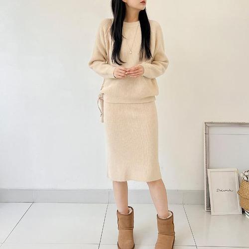 [퍼니걸스]7718 도톰 라운드 긴팔 니트 H라인 롱 스커트 세트룩 여성의류